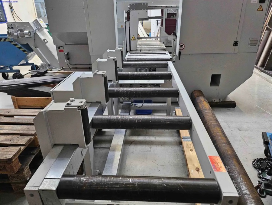 - Zufuhrrollengang mit Querförderer, Doppelgehrungssäge, Abfuhr mit Rollengangsbrücke und Abschiebevorrichtung